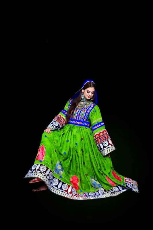 Pistachio Green Afghan Velvet Dress with Mirror Work & Mureh Embroidery