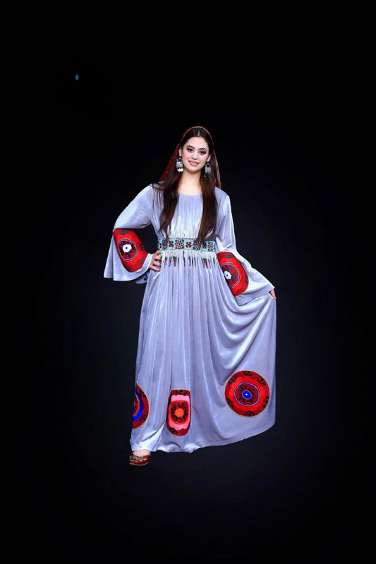 Handmade Lavender Afghan Velvet Dress with Embroidery & Mureh Belt